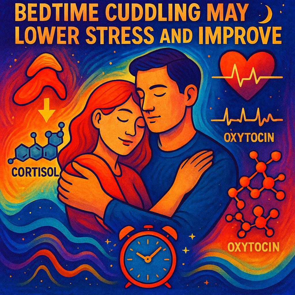 A review of six adult studies suggests that brief skin-to-skin contact, cuddling, or sleeping close to a partner at bedtime may reduce stress hormone levels, lower blood pressure and heart rate reactivity, and improve certain aspects of sleep quality. These benefits appear strongest for people with lower attachment security, and they don’t seem to disru…