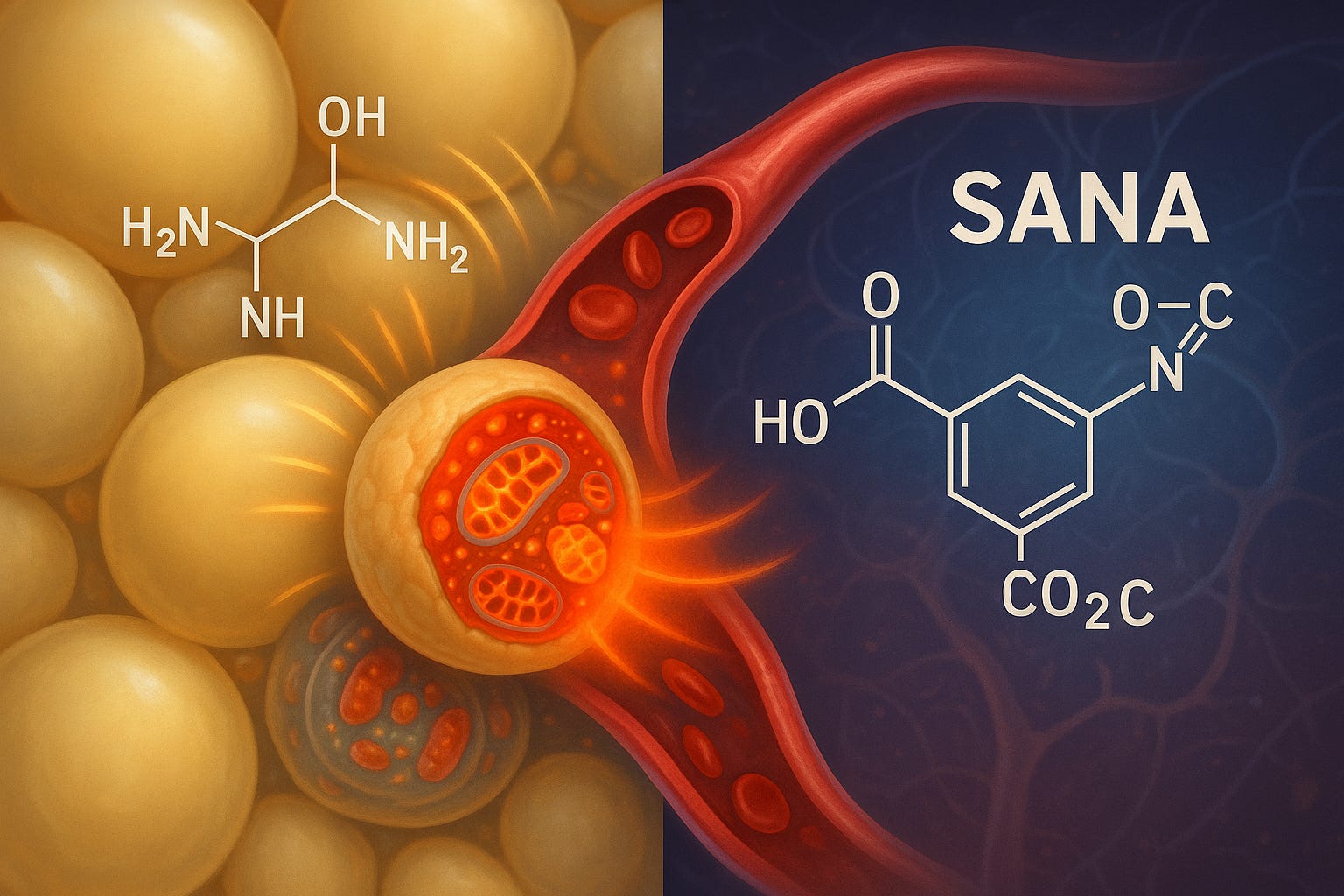 SANA, a nitroalkene derivative of salicylate, activates creatine-dependent thermogenesis in fat tissue, reduces insulin resistance, and promotes weight loss, with early-phase clinical trials showing good safety and tolerability.
