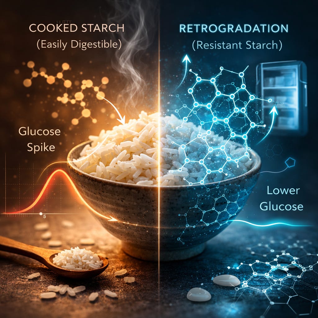 The concept being promoted online is called retrogradation, a well-described biochemical process in starch science. When carbohydrate-rich foods such as rice or potatoes are cooked, their starch structure changes. Cooling them afterward partially reorganizes the starch molecules into a form that resists digestion.